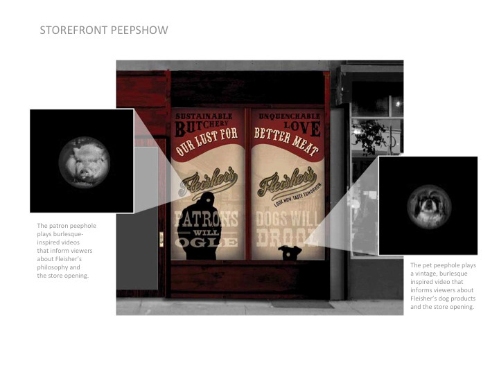The peepshow begins after the store closes. In keeping with the burlesque theme, peepholes on the storefront entice passersby to stop in their tracks and take a peek. Since Fleisher’s makes dog treats, there is a peephole for pets, too.
