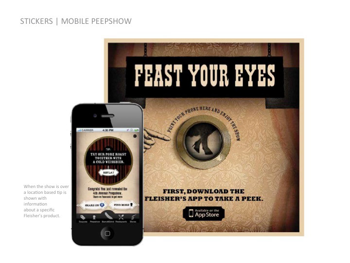 To take the Fleisher’s message out of the store and into Park Slope, we’ll place stickers in trendy Brooklyn hangouts that prompt you to download the Fleisher’s app in order to see hidden content. The app uses your phone’s geolocation to reveal a unique peepshow based on where you are.