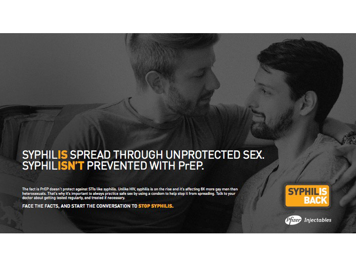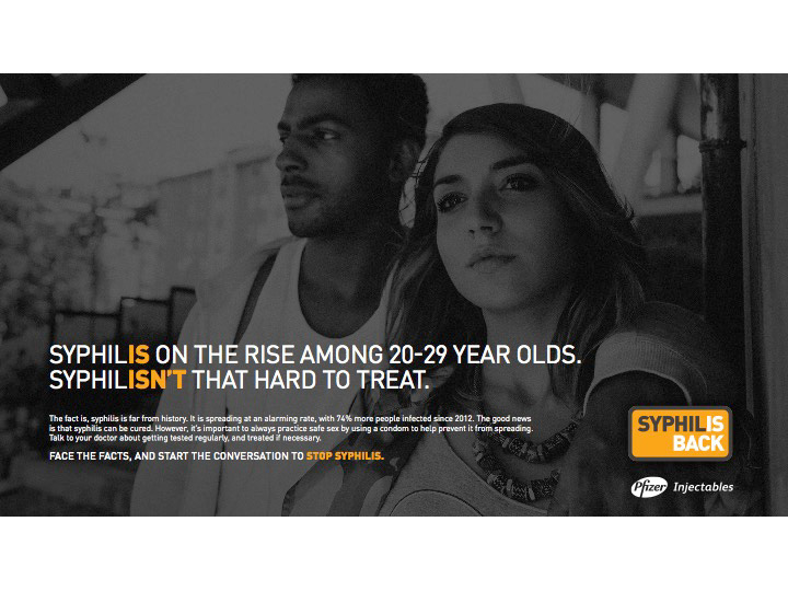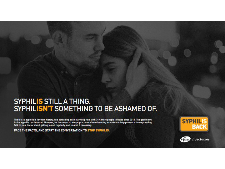 When most people think of a sexually transmitted disease, syphilis isn't at the top of their list. But the fact is, since 2000, syphilis has been on the rise among homosexual men, heterosexual couples, and pregnant women. This campaign was designed to get these sobering and critical facts out there in a way that was emotional and memorable.